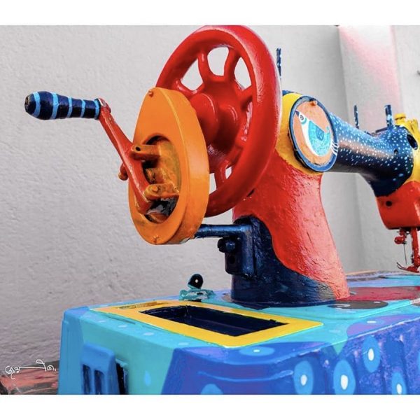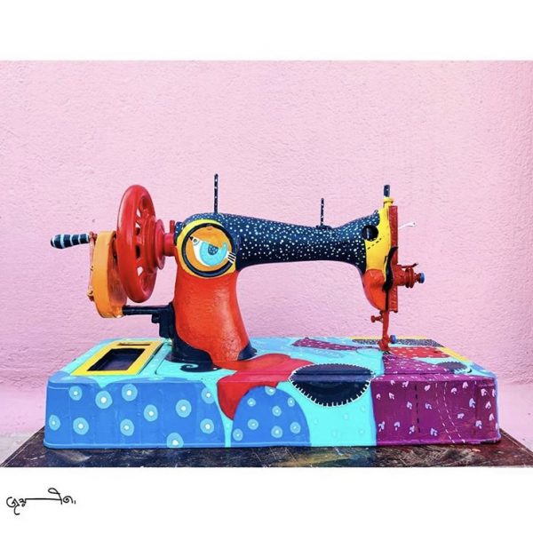 When she brought this singer sewing machine to us,i could see the nightsky studded with stars,a bird flying high,magic being woven,and the piece oozing with colours and happiness.