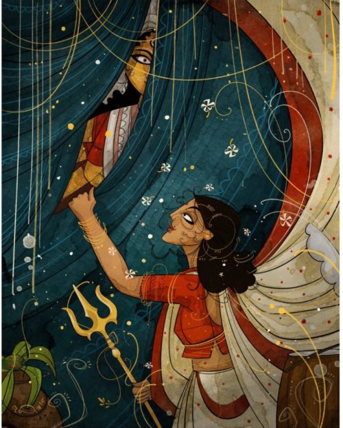 We had the scope to joke have fun because no one restricted the kids from making opinions!The action and face of the oshur was heavily judged by us. Passing comments like “erom Hrittiker moto ashur keni banieche bhai?” To “oshurta ektu Amrish purir moto dekhte na?”But after all the fun banter was done, the realisation that it is finally time for the great festival, every little worries faded and dimmed in front of her.